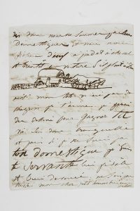 domestique dis-donc toi, heim ? Tâche un peu de me répondre plus vite que ça. Et puis je te dirai l’âge du capitaine Lambert. Voim, scélérat avec une pipe et bas des rouges. Et ma copie ? Est-ce que par hasard vous voulez m’empêcher de TRAVAILLER ? C’est que vous en êtes très capable avec votre air sournois. Dis-donc, est-ce que je suis ton domestique ? Pauvre ange bien aimé en pensant à tous les ennuis et à tous les embarras auxquels tu es en proie je n’ai plus le courage de rire. […] Pour moi je ne vois pas du tout comment tu pourras suffire à toutes les charges qui se multiplient autour de toi ; pour mon compte j’en suis effrayée au-delà de ce que j’ose dire. Pauvre Toto bien aimé comment ferons-nous tant que nous sommes ? Enfin, ce n’est pas le moment de se laisser aller au découragement au contraire […] je ferai des dettes, dettes et redettes plutôt que de manquer à ce que je dois à mon amour et à ton dévouement. Ainsi fichons-nous de ça en somme et soyons heureux en dépit de toutes les absurdes iniquités qui nous crèvent sur la bosse. Dis donc nous ne sommes pas leurs domestiques et nous nous fichons d’eux à pied et à cheval et bientôt en voiture s’il plait à Dieu. [Dessin d’une diligence tirée par six chevaux, dans laquelle on peut voir Toto et Juju.] Ainsi mon Toto n’aie pas de chagrin. Je t’aime. Je ferai des dessins pour gagner TA vie. Sois donc tranquille et puis si je ne suis pas ton domestique je suis ta servante bien fidèle et bien dévouée. Ne sois pas triste mon cher petit homme bien aimé. »
