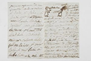 Juliette DROUET (1806-1883).Lettre autographe signée « Juliette » avec dessin, 30 juin [1845] lundi après-midi 3 h. 1/2, à Victor Hugo ; 4 pages in-8.Amusante lettre avec dessin.« Toto fais-toi faire un habit neuf. À force de travailler...