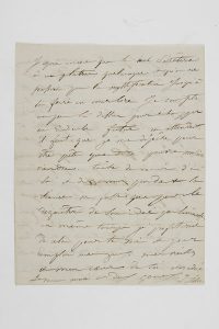 t’écrire à cause de la fameuse séance d’aujourd’hui. Il faut que je sois prête de bonne heure : à 2 h. J’ai encore bien des choses à faire d’ici là et j’en ai fait déjà beaucoup. Riez tant que vous voudrez, mais c’est ainsi. J’ai déjà taillé 6 plumes ! » Puis elle parle des séances de pose pour son buste par Victor Vilain : « Je n’ai pas besoin que Pradier sache à la minute ce qui se fait chez moi. D’ailleurs cela pourrait peut-être lui donner une sorte d’humeur bête qui le refroidirait pour ce qui reste à faire à la mémoire de ma pauvre chère enfant [Claire Pradier, fille de Juliette et de James Pradier]. […] Tu ne peux pas t’imaginer, mon amour, combien cette séance me coûte. Si je pouvais reculer devant ce buste futur, je le ferais car je trouve bien ridicule de poser à mon âge sans autre nécessité que de faire plaisir à quelqu’un qu’on ne connaît pas ou plutôt pour une simple reconnaissance à venir. […] je suis vexée de m’être laissée aller à cette pourtraiture tardive et inopportune. J’espère encore que le mal s’arrêtera à un plâtras quelconque et qu’on ne poussera pas la mystification jusqu’à la faire en marbre. Je compte un peu là-dessus pour échapper au ridicule futur. […] Tâche de venir d’ici là et de revenir pendant la séance ne fusse que pour le dégoûter de son idée peu lumineuse. En même temps je profiterais de cela pour te voir et pour remplir mes yeux, mes oreilles et mon cœur de toi, cher adoré. Je vous aime à deux genoux. »