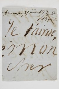 Juliette DROUET (1806-1883).Lettre autographe signée « Juju », Guernesey 25 août 1857, mardi, 1 h. 1/2 après-midi, à Victor Hugo ; 4 pages in-12.Joli billet d’amour écrit en très grosses lettres.« JE T’AIME, MON CHER PETIT HOMME,...