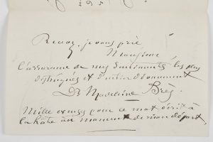 Montorgueil] ; 3 pages in-8 et 2 pages in-18 sur sa carte de visite.De la Crèche 86 Rue Nollet 3 juillet 1899. Elle a été extrêmement occupée et n’a pu envoyer le petit travail demandé « et que je tiens à vous donner très complet ». Elle est appelée en consultation dans un château aux environs d’Amiens mais sera de retour dans 48 heures : « Je vous enverrai aussitôt ce que vous désirez »...10 février, sur sa carte de visite Madame Madeleine Brès Docteur en Médecine de la Faculté de Paris, à l’adresse de la Crèche, École Populaire d’Hygiène qu’elle fonda aux Batignolles en 1893. Elle prie de passer une note dans L’Éclair : « B.M. Calamer est un estimable compositeur et sa femme est ma meilleure amie »…Les Neuf Muses, 2004.