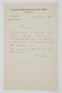 l’éditeur Gauthier-Villars] ; demi-page in-8 à en-tête Faculté des Sciences de Paris, Laboratoire de Physique générale.À propos de la publication de son Traité de radioactivité en Allemagne. [Le Traité de radioactivité paraît en France en 1910 chez Gauthier-Villars, en 2 volumes ; il paraîtra en 1911-1912 en Allemagne.]« En ce qui concerne la convention avec la maison allemande “Akademische Verlagsgesellschaft”, je m’en rapporte à votre opinion et j’accepterai les conditions proposées à vous »… Les Neuf Muses, 1999.