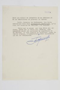 Paris 14 février 1935, à Marcel Labbé, professeur à la Faculté de Médecine ; 3 pages et demie in-4 à son en-tête Marthe Hanau.Rare lettre sur sa grève de la faim, dont le professeur Labbé a contesté la véracité dans un article de La presse médicale. [Incarcérée à la Prison Saint-Lazare en 1928 pour escroquerie financière et abus de confiance, Marthe Hanau entame une grève de la faim, puis s’évade de l’hôpital dans lequel elle a été transférée pour finalement regagner spontanément la prison. Elle sera libérée sous caution avant d’être à nouveau condamnée en 1934 ; elle se suicidera à la Prison de Fresnes l’année suivante.]« Vous avez commis une mauvaise action. […] En ce temps où la calomnie et le mensonge règnent souverainement, vous ébranlez notre foi en la vérité scientifique. […] Emprisonnée arbitrairement, ayant épuisé vainement et seize mois durant, tous les moyens en mon pouvoir pour dresser publiquement les preuves de l’inanité de l’accusation d’escroquerie dont on m’accablait, victime d’un véritable déni de justice […] j’ai recouru au seul mode de suicide que la prison laissait à ma portée. Était-ce là manière de chantage, comme vous ne craignez pas de l’écrire ? »… Elle dément avoir accepté les piqûres nutritives et avoir jeûné partiellement : « Afin d’en avoir plus tôt fini, j’ai, moi, au contraire, adjoint à la grève de la faim, la grève de la soif, ce supplice sans nom. […] les expertises officielles […] établissent, sans contestation possible, que ma grève de la faim fut intégrale. Elle fut si mal supportée, Monsieur le Professeur, que, du propre aveu des praticiens, les accidents mortels menaçaient sous quarante-huit heures, lorsque sur leurs objurgations, je consentis à m’alimenter le 27ème jour, à Saint-Lazare, en vertu d’un véritable contrat judiciaire […]. À ce moment, la liberté m’était promise qui allait me permettre de me défendre et de me réhabiliter en prouvant la vérité »…