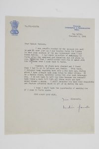 autographes, New Delhi 6 novembre 1964, à la journaliste Geneviève Tabouis ; 1 page petit in-4, en-tête imprimé du Minister Information & Broadcasting India, petite vignette ; en anglais.[À la mort de son père, Jawaharlal Nehru, en mai 1964, Indira Gandhi est nommée ministre de l’Information et de la Radio-télévision dans le gouvernement de Lal Bahadur Sastri].Elle remercie la journaliste française pour son message de bienvenue à l’occasion de son bref séjour à Paris. Elle est entretemps partie à Londres rencontrer des membres du nouveau gouvernement et regrette de n’avoir pas eu le temps de la voir. Elle a également dû se rendre à Belgrade et Moscou avant de rentrer en Inde il y a quelques jours ; c’est une période très chargée et fatigante mais très intéressante. « Ce n’est pas à vous que je dois dire cela car vous-même avez mené une vie très occupée ces dernières années et vous n’avez jamais manqué un scoop ». Elle se souvient de ce que ses dépêches et ses articles de fond représentaient pour eux durant la guerre…