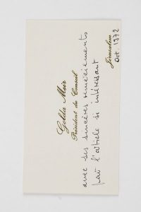 Golda MEIR (1898-1978) Présidente du Conseil de l’État d’Israël de 1969 à 1974.Carte de visite avec 2 lignes manuscrites, Jérusalem octobre 1972, à Michel de Saint-Pierre à Beuzeville ; carte in-18 à son nom Golda Meir Président du...