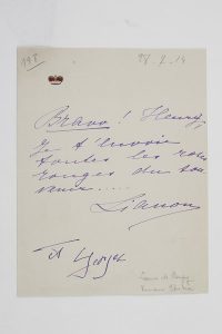signée « Lianou », contresignée par son mari le Prince Ghika, [28 juillet 1914, à Henry Bernstein] ; 1 page petit in-4 avec couronne gravée.« Bravo ! Henry, je t’envoie toutes les roses rouges du souvenir… Lianou – et Georges ».On joint un beau portrait photographique ancien de Liane de Pougy (14 x 10 cm), et un reçu de Léonie Boucheron pour ses gages payés par Mme Liane de Pougy (18 juin 1907).
