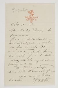 bonté et de l’indulgence, voilà du bon courage dans mon cœur, et des forces nouvelles pour la lutte... Lisez cela cher ami et pensez à moi »... – New York. Elle prie d’insérer « quelques phrases du beau discours du professeur Jean Beck, le savant musicographe qui à propos de l’ouverture de l’École des Arts d’Yvette a lu une tartine splendide », pour aider au succès de l’école française qu’elle vient de créer à New York : « Car si nous parlons anglais, nous traduisons L’Esprit de chez nous ! Ah ! que cela vous amuserait d’entendre les jolies jeunes filles jouer des vieux miracles, des farces moyenâgeuses et chanter en chœur à quatre parties des vieux chants de notre Renaissance !! Mais le gouvernement ne m’aide pas ! et les frais ici sont terribles ! » Elle peine à payer son loyer... Elle joint le petit texte à insérer : « De notre correspondante de New York. Mme Yvette Guilbert a ouvert une École des Arts, d’esprit français à New York », etc. Il contient des extraits de l’élogieux discours de Beck pour l’ouverture de l’école...Paris. Vœux de nouvelle année, et appel à l’aide en faveur d’un jeune homme mortellement malade, Boris Boueff, qui a adressé un conte au journal « et me supplie de l’aider auprès de vous pour que ce conte soit pris ». À leur rencontre, il faisait des ménages pour, « en continuant ses études, faire manger sa vieille Maman... Je fis ce que je pus mais la crise m’a tordu le cou et mon protégé crevé par les luttes et la misère (et malade au lit) ne trouve plus en moi la bouée de sauvetage ! [...] Jamais je n’ai tant regretté d’avoir perdu ma fortune car autour de moi c’est un chœur de gémissements qui me déchirent le cœur »... – Elle envoie deux fauteuils pour une soirée à la Salle Pleyel...
