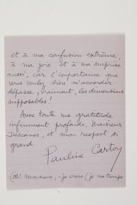 lettres de remerciements au critique.7-9-1924. Elle ne sait comment le remercier de « l’éloge tout particulier » qu’il lui a adressé « à propos de La Guitare et le Jazz-Band ! »... 21 juillet [1938], à propos de son livre Les Théâtres de Carton : « Que vous me donnez de joie ! Je ne peux pas vous dire tout ce que m’a octroyé d’allégresse votre article si généreux et bon pour moi ! Venant de vous, Monsieur Descaves, le moindre mot un peu bienveillant m’aurait honorée et comblée, – alors, vous pensez, les incroyables éloges que vous m’avez décernés, vous imaginez de quelles cataractes de joie ils m’ont inondée en un instant ! Vous me voyez en beau, Monsieur ! Mais ce n’est fichtre pas moi qui viendrai m’en plaindre ! »... Elle le prie d’intervenir pour faire lire à la radio « quelques lignes de mon idiot de bouquin »... 25 mars 1939. « Je sais que je me couvre de ridicule en me permettant de vous remercier pour autrui, mais vous ne pouvez pas savoir la joie incalculable ressentie par mon vieux copain Jean Violette à la vue de sa nouvelle dans le journal ! Comme vous avez été chic et bon pour lui, Monsieur Descaves ! Comme vous avez su combler et rendre heureux, et aider, jusque dans les détails, dans le titre bien trouvé, dans tout, ce veinard bénéficiaire de toute votre bienfaisance ! »... – « Comme vous êtes bon pour moi !! »... – « Comment pourrai-je vous remercier ? »...Les Neuf Muses, 2005.