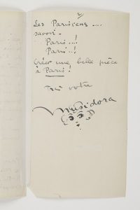 l’année qui meurt... Dès que j’ai eu l’âge de comprendre ce que c’était “qu’une” année de notre vie... Je n’ai jamais pu ressentir de joie pure à un réveillon. J’ai été une petite fille qui doutait de l’excellence du Père Noël... Pour mes étrennes ? La place de la Concorde, Notre-Dame... La Sainte-Chapelle... les boulevards ... Les Parisiens... savoir. Paris... ! Paris... ! Créer une belle pièce à Paris ! »... La signature est illustrée de son autoportrait à l’encre.On joint une carte de visite autographe signée, illustrée de son portrait gravé : « J’arrive de voyage. Voici au grand galop ma réponse. Toujours merci à la presse »...Vente 4 octobre 2005 (n° 121).