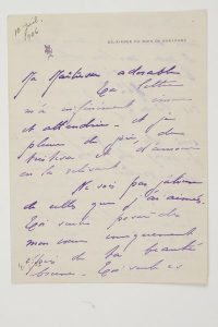 une violette gravée (légère fente à la pliure).Brûlante lettre d’amour à sa maîtresse turque Kérimé.« Ta lettre m’a infiniment émue et attendrie, et je pleure de joie, de tristesse et d’amour en la relisant. Ne sois pas jalouse de celles que j’ai aimées. Toi seule possède mon cœur uniquement épris de ta beauté brune – Toi seule es mon regret, mon espoir, mon souvenir, mon extase et ma mélancolie – Toi seule existes. Ah ! tes yeux ! Ah ! tes lèvres ! Je vis si lentement, si lourdement loin de ce que j’adore !... Je passe des jours accablés, sans vouloir quitter la maison, et cherchant un coin sombre où je puisse me blottir afin de mieux rêver, afin de t’évoquer, plus précise. Pour moi, il n’est jamais assez d’ombre, assez de nuit... Et lorsque je te revois dans un songe, je maudis le réveil. Enfin, l’heure merveilleuse approche... Je te reverrai... Je te posséderai de nouveau... Tu seras mienne fatalement, inexorablement... Un cher et terrible destin nous lie, pour la douleur et pour la joie... Mon prochain livre sera tien, écrit pour toi, rempli de toi. Je ne puis écrire plus longuement. Des larmes, refoulées depuis longtemps, débordent... Je t’aime. Je n’aime que toi ; Et je souffre, car l’on souffre de tant d’amour. Tu m’es chère infiniment, je te désire avec folie. Tu es mon amour prédestiné. Ton boy Renée ».Ancienne collection Henri Ledoux (estampille, 14-15 décembre 1972, n° 145).