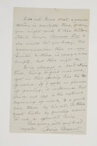 Theosophical Society ; la seconde en anglais.Hobart 14 août 1908, l’autorisant à utiliser son portrait pour « le but élevé » qu’elle propose : « C’est pour moi une honneur, et j’espère que le tableau sera pour vous un triomphe »… Adyar, Madras 12 septembre 1913 : son projet est peut-être excessivement ambitieux ; 30 peintures pourraient épuiser l’énergie du peintre et l’intérêt du spectateur. Bénarès est plein de l’esprit de l’hindouisme et devrait l’inspirer… Elle l’encourage dans la tâche difficile de trouver son œuvre ; enseigner par la peinture lui a toujours paru splendide…Vente 20-21 juin 2005 (n° 574).