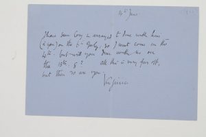 Virginia WOOLF (1882-1941) romancière anglaise. Lettre autographe signée « Virginie », 14 juin [1932 ?, à André Maurois] ; 1 page oblong in-8 ; en anglais.Elle a vu Cory et va arranger un dîner le 6 juillet avec lui, et son correspondant....