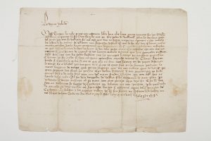 Provence.Lettre signée « La Reyna Y. », Barcelone 12 février 1409 (1410), à Gregori Burgues ; 1 page oblong in-4, adresse au verso (fentes et plis renforcés au dos) ; en catalan.Très rare pièce au nom de « La Reyna Yoland ». Elle accuse réception des lettres de Gregori annonçant qu’il a mis la cité de Vallmoll en son pouvoir, et évoque le sort d’« Elionor » [Éléonore de Castille (1374-1435), femme du futur Ferdinand Ier d’Aragon], les contributions qui doivent être payées au Carnaval (Carnestoltes), mais qu’elle fera proroger par son procureur français jusqu’au milieu du Carême… Elle parle enfin de l’arrivée de la fille de son correspondant, qui doit venir avec sa mère, et d’un voyage en Sardaigne (Cerdenya), qui durera plus longtemps que prévu. Elle le remercie enfin de l’envoi d’un baume, qui est exactement ce qu’elle voulait…Vente Huit siècles de l’histoire de l’Europe (27 novembre 2008, n° 17).
