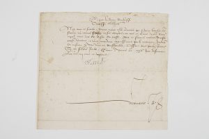 (1519).Lettre signée « Claude », Paris 25 février 1518 (1519), à « noz amez et feaulx conseillers les gens de noz comptes à Bloys » ; contresignée par Decomacre ; 1 page in-4, adresse.« La Royne Duchesse Contesse de Bloys » est avertie que « Pierre Bunelet nostre saucier na encores fait fin en ses comptes ne mis es mains de nostre receveur ce quil nous doit de reste du passé, dont ne sommes contente. A ceste cause, voulons et vous mandons expressement, que le contraignez incontinant de ce faire par voye deue et raisonnable »…Vente Ridgway, Londres 30 juin 1879.