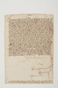 Medina del Campo ; 1 page in-fol. (mouillure sur le bord droit inférieur avec perte de quelques fins de ligne, habilement restaurée) ; en espagnol.La Reine se réfère d’abord à un acte officiel de 1529, à propos de terres de Medina del Campo qui avaient été jadis données par son mari Charles Quint ; comme ensuite les autorités de Medina del Campo s’étaient plaintes, il avait été décidé que ces terres, à la mort de leur propriétaire, retourneraient à la ville de Medina del Campo. Mais, par la présente lettre, la Reine décrète que, pour les terres données aux serviteurs de la Reine, ces terres ne seront pas rendues à la ville et demeureront dans la famille de leur propriétaire après la mort de celui-ci ; en contrepartie, la Reine octroie des concessions à la ville de Medina del Campo...Charavay, 1999.
