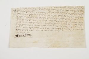 vélin oblong in-4.« Marie de Lorraine par la permission divine, humble Abbesse de lesglise monastere et abbaye Nostre Dame de Chelles Saincte Baupteur » reçoit la somme de 8 livres 6 sols 8 deniers tournois, pour un quartier de la rente vendue à feu François Godet sieur d’Omey « par les prevost des marchands et eschevins de la ville de Paris, […] ladicte rante ceddée donnée et transportée à ladite abbaye par ledict feu sieur Godet pour subvenir aux necesitez de sa fille sœur Jehanne Godet sa vye durant »…Charavay.