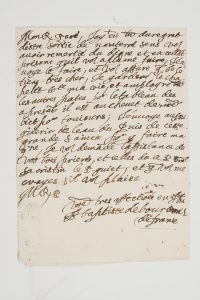signée « SJ Baptiste de Bourbon & de France », à un Révérend Père ; 1 page in-4.Elle a bien regretté d’être partie de Nanterre sans l’avoir remercié de son digne et excellent présent : « je le tiens tres cher, je garderé le chapelet toute ma vie, et amployré bien les autres fiates pour le tableau dès à presant il est au chevet de nostre lict pour toujours ; j’envoye aussi querir de l’eau du puis de ceste grande Saincte [puits de Sainte Geneviève] pour y faire ma 9ne [neuvaine], je vous demande lassistance de vos bonnes prieres »…
