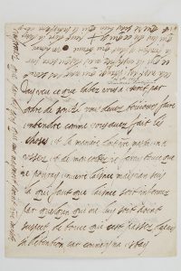à son frère Nicolas-François duc de Lorraine ; 2 pages in‑4, adresse avec traces de cachets de cire rouge. Au sujet de la libération de leur frère aîné Charles IV duc de Lorraine, qui avait été prisonnier des Espagnols pendant cinq ans.Elle dit à son frère de continuer à agir comme il l’a déjà fait ; « de mon cottez je feray tou ce que je pouray enverre laisnee, mais jan suis la qui faut que laisnee soit informez par quelqun qui ne luy soit point suspect, de touce qui cest passez depuis sa détention, car comme y na estay informez que par des gens qui naymoit point votre mestre cela nest pas estrange qui nayt pas sceut ce qui le justifiez, mais des qui sera sur la frontiere y faut qui trouve un homme qui luy die ce qui se peut dire la desus et que je scay bien qui le satisfera »... Elle ne désire que son intérêt et le servir. Elle demande de brûler cette lettre « et toutes celles quavez et mon frere de moy »...Librairie Les Autographes, 1998.