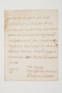prince des Asturies ; les fiançailles furent rompues en 1725 en même temps que les fiançailles de Louis XV avec l’Infante d’Espagne ; elle mourut à vingt ans.Lettre autographe signée « Philippine Elizabeth », 30 octobre 1724, à une tante ; 1 page in-4 (portrait gravé joint).« Ma tante la part que vous prenez à ma douleur, et les sentiments, que vous me marquez, me donnent un grand soulagement : j’en conserveray toujours beaucoup de reconnoissance, comme vous l’experimenterez dans toutes les occasions »… Rare.