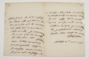 Sabran », Toulouse 1er juin 1734, à M. Deon chez M. Herot à Paris ; 2 pages et demie in-4, adresse avec cachet de cire rouge aux armes.« Je conte aces sur votre politesse, Monsieur, pour me flater que vous voudres bien à ma prière obliger Monsieur de Marasis, comis de Monsieur Hérot, de chercher une quittance de 900 livres du sieur Galpein faite à Monsieur de Sabran, que je luy remis parce que les créansiers de Galpein feset asigner Monsieur de Sabran. Je croyes cette afaire finie et aves negligé de retirer cette quittance. L’on me mande que ces créanciers ont fait sesir ma terre de la Nouaille. Je vous conjure de prier monsieur de Marassis de chercher cete quittance avec d’otres mémoires qui me regardet et que je règleres à mon arrivée. Je prie Monsieur de Fargy de ce charger de les retirer, il joindra ces remersiements au miens et arivée à Paris où je conte ariver à la fein du mois »… Rare.