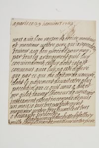in‑4, adresse avec cachet de cire noire aux armes.Très rare lettre à propos d’une affaire avec M. Bronod père. L’arrangement convenu a été différé « par ce que me doit M. de Vauvray dont le payement devait estre plus prochain que ce qu’il vous a dit et M. Gilet, j’aurai l’honeur de vous voir insesament, estant incomodé depuis un mois »...