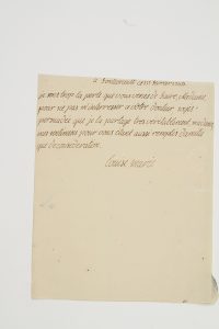 « Louise Marie », Fontevraud 11 février 1749, à Marie-Thérèse-Félicité d’Este, duchesse de Penthièvre ; demi-page petit in-4, adresse « à ma cousine la duchesse de Pinthievre » avec cachet de cire noire aux armes.Lettre de jeunesse, lors de son éducation à l’abbaye de Fontevraud.« Je sens trop la perte que vous venés de faire, Madame, pour ne pas m’interresser à vôtre douleur, soyés persuadée que je la partage tres véritablement […], mes sentimens pour vous étant aussi remplis d’amitié que de consideration »…