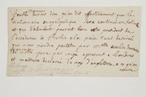 Anne-Marie Le Page, Madame DU BOCCAGE (1710-1802) femme de lettres et poétesse.Lettre autographe, [1758 ?, au comte François Algarotti] ; 1 page oblong in-8.« J’oublie Monsieur de vous dire qu’on dit effectivement que le Dictionnaire...