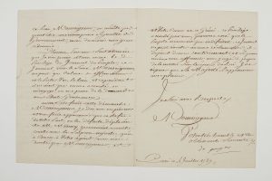 Olympe de GOUGES (1748-guillotinée 1793) femme de lettres, elle adopta avec chaleur les principes de la Révolution, réclama l’émancipation des femmes, et fonda le Club des Tricoteuses.Lettre signée « de Gouges », Paris 4 juillet 1789 ; 3...