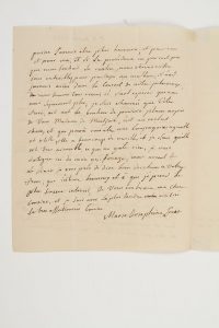 signée « Marie Josephine Louise », Gosfield 8 décembre 1808, à sa cousine Adélaïde d’Orléans ; 2 pages in-4.Invitation à Adélaïde et sa mère la duchesse douairière d’Orléans de venir rejoindre les Princes en Angleterre.Elle fait des vœux pour que la princesse obtienne de sa mère de la suivre : « elle n’est pas bien brave, mais votre exemple et votre tendresse filiale triompherons j’espere de son incertitude ; ditte lui bien de ma part qu’elle sera la bien venüe ici, de tous les parents, et en particulier de moi, qui ait toujours prit un tendre interest à elle, et que je n’ai point oubliée l’amitié qu’elle avoit pour moi, que je serais heureuse si ce prentemps je puis la revoir avec vous, et vous embrasser touttes deux et vous connoitre plus particuliairement ; tout le bien qu’on m’a dit de vous, me le fait desirer. Puisse l’avenir etre plus heureux, et pour vous et pour moi, et si la providence ne permet pas que mon souhait se realise, nous serons enfin tous ensembles, pour partager nos malheurs, il n’est jamais arivé dans le courent de notre pelerinage, de nous trouver tous reunis, il faut esperer que nous nous separerons plus, je suis charmée que votre frere [Louis-Philippe], ait eut le bonheur de pouvoir placer auprès de vous Madame de Montjoie, c’est un exelent choix, et qui poura vous etre une compagnie agreable et utille, elle a beaucoup de merittes et je sçais qu’elle est tres aimable, ce qui ne gate rien […] je vous prie de dire bien des choses à votre frere, que j’estime beaucoup et à qui je prend le plus sincere interest »…