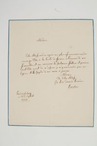 « Caroline » et « Caroline Amélie pr. de D. née pr. d’H. », septembre 1812-février 1819 ; 1 page in-4 à bordure décorative gaufrée, et 1 page et demie in-4 avec adresse.Friedrichsberg 19 septembre 1812 : « Votre Altesse voudra agréer mes plus vifs remerciemens des vœux qu’Elle a la bonté de former à l’occasion de mes fiançailles, et me conserver les sentimens flatteurs et precieux dont elle vient de m’assurer »...Odense 1er février 1819, comme princesse de Danemark, au baron de Schubarth, Conseiller intime et Intendant Général du Commerce de Sa Majesté Danoise. « J’ai été chargée d’apprendre le prix d’une garniture complette en belles camées comme celle qu’a notre adorable reine. Sachant de qui celle-ci tient ce bel ornement, je crois ne pouvoir mieux m’acquitter de cette commission qu’en m’adressant à vous, Monsieur, dans l’espoir que votre indulgence ordinaire me pardonnera cette indiscrétion »... Elle le remercie également de ses bontés et soins à l’égard de ses frères...