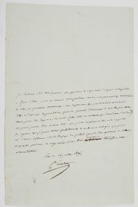 après son arrestation sur ses prétendues relations avec Napoléon durant son exil sur l’île d’Elbe. [Lavallette a été arrêté chez lui le 9 juillet 1815, et traduit devant la Cour d’assises. Condamné à mort, il parviendra à s’enfuir grâce à sa femme et à rejoindre la Bavière.]« Je déclare sur mon honneur que pendant les onze mois de séjour de Napoléon à l’Isle d’Elbe, je n’ai eu aucune correspondance avec lui, ou les personnes qui l’entouraient ou celles qui pouvaient communiquer avec sa personne, que je ne lui ai écrit qu’une seule lettre à l’époque du jour de l’an pour lui présenter l’hommage de mon respect et mes vœux pour son repos et sa santé (cette lettre ne contenait que deux lignes d’écriture), que je n’ai jamais reçu un mot de lui, que je n’ai contribué en rien à lui expédier des agens, que j’ignore même si on lui en a envoyé ; que je n’ai usé d’aucune influence sur les employés des postes pour lui faire parvenir des lettres, et qu’enfin pendant ces onze mois je suis resté complettement étranger à cette administration ».