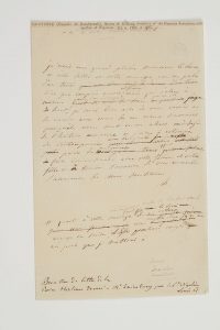 baron Bouvier-Dumolart ; 1 page in-8 avec ratures et corrections (étiquette collée en tête).Lettre de félicitations pour l’ouvrage qu’il lui a envoyé : « Vous me parlez d’un tems bien peu compris encore en France mais qui s’élève à mesure qu’on s’en éloigne et qu’on le juge de haut, je serai bien aise de vous revoir et de causer avec vous de ces vieux souvenirs puisqu’ils vous sont encore chers. C’est déjà de l’histoire ancienne et j’aime à retrouver des contemporains avec lesquels je puisse parler de ma jeunesse »... Elle serait heureuse d’avoir l’occasion de rencontrer sa femme et sa fille... Une note indique que la lettre a été donnée à M. Sainsbury par « Napoléon Louis B. ».