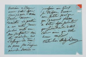 à propos de son cheval, qui « est très mal […] et c’est au point que mon marechal le prend chez lui pour le soigner ». Elle le prie de se rendre chez ce dernier pour examiner l’animal… Elle est elle-même souffrante depuis douze jours : « Je vais mieux ce matin mais Dieu sait si je serai en état de donner ma soirée samedi »… Ce lundi [30 janvier 1837]. Elle espère que la grippe ne s’est pas propagée dans son quartier : « Mon Joseph en souffrait ainsi que sa femme mais elle va un peu mieux que son mari ». Elle aurait aimé le recevoir à dîner le lendemain mais préfère remettre la partie à un autre jour : « Je suis aussi un peu souffrante sans être malade c’est l’influense du temps ! » Pour le samedi suivant, elle tâchera « d’avoir une petite musique qui pourrait plaire à votre chère Juliette »…