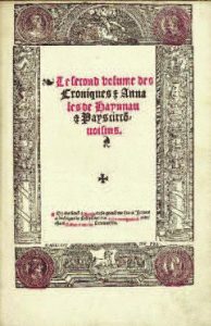 en encadrement, fleurons dorés aux angles et au centre, dos orné (Reliure du xixe siècle). Bechtel, G-392. ÉDITION PRINCEPS DE CETTE CHRONIQUE, traduite et abrégée par Jacques de Leussauch d’après le manuscrit original latin du franciscain flamand Jacques de Guise, mort à Valenciennes en 1399. Imprimée sur deux colonnes, elle est ornée de plusieurs lettrines à fond criblé, d’un grand bois répété montrant l’auteur offrant son livre à Philippe le Bon, d’un petit bois représentant l’auteur écrivant son livre et d’un grand bois figurant le roi au Parlement, surmonté d’une scène de bataille. Manque le feuillet de titre de la première partie, remplacé par un titre de troisième partie, plus court. Quelques mouillures et taches marginales, petit manque de papier en marge des derniers feuillets, réparation en tête d’un feuillet de la première partie. Plats de l’époque réappliqués, dos refait.