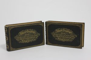 par... - Sans lieu ; Chez l'auteur, sans date (XIXème siècle) - 2 volumes In-12° oblongs - 150 planches gravées en noir avec texte - Reliure de l'époque plein chagrin vert - Dos à nerfs ornés titrés et tomés or - Plats encadrés, ornés d'entrelacs dorés et joliment titrés or aux 1ers plats, dentelles intérieures dorées - Ouvrage monté sur onglets - Fente à la charnière du 1er plat, quelques rousseurs et feuillets jaunis - Tranches dorées - Envoi de l’auteur à son épouse sur les 2 tomes.