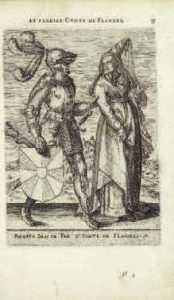 Anvers, [André Bax pour] Pierre Balthasar, s.d. [c. 1580]. Petit in-folio, basane marbrée, dos orné (Reliure de l’époque). Brunet, III, 1495-1496. Édition originale de cette description généalogique de la Flandre, ornée d’un titre-frontispice sur cuivre, d’une gravure à pleine page contenant les armoiries de l’archiduc d’Autriche, dédicataire de l’ouvrage, d’une petite carte de la contrée surmontée de ses écus, de 40 très belles figures de forestiers et de comtes gravées en taille-douce par Pieter Baltens de Costere, dit Custodis (circa 1525-1598), et d’une figure allégorique à pleine page terminant le volume. Titre-frontispice réenmargé en tête, avec petite restauration en pied. Reliure restaurée.