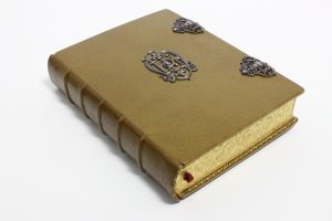 (signée Gruel) - Initiales en métal ciselé au 1er plat -Fermoirs métalliques à têtes d'anges - Tranches dorées antiquées - Dos à nerfs muet - Large dentelle dorée encadrant l'intérieur des plats - Gardes de soie bleue à feuilles de vigne dorées - Sous emboìtage garni de soie blanche et coffret - Très bel exemplaire.