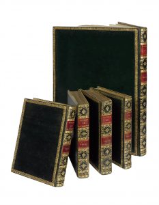 un atlas grand in-folio, maroquin à long grain vert, triple roulette dorée en encadrement, dos lisse richement orné de vasques, feuillages, grecques et autres motifs dorés, pièces de titre et de tomaison rouges, coupes décorées, roulette intérieure dorée, tranches dorées (Reliure pastiche).