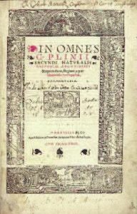 Pline L'Ancien. In omnes C. Plinii Secundi Naturalis historiae argutissimi scriptoris libros, …, commentaria. Paris, Galliot du Pré, s.d. [au colophon] : Pierre Vidoue pour Poncet le Preux et Galliot du Pré, 1530. In-folio, basane tachetée, dos