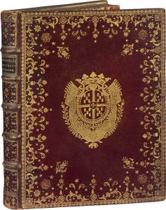 riche dentelle dorée en encadrement, armes au centre, dos orné, tranches dorées (Reliure de l'époque).