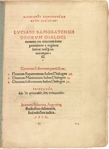LUCIEN DE SAMOSATE. Θεων διαλογοι. Deorum dialogi numero 70. Strasbourg, Johann Schott, 1515. Petit in-4, demi-basane fauve avec coins, dos lisse muet, tranches lisses (Reliure moderne).