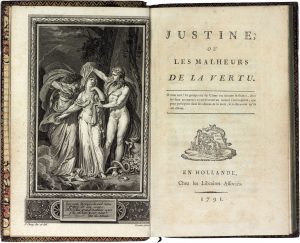 Édition originale, de toute rareté, du premier ouvrage publié par le marquis de Sade. Dédiée à la bonne amie de l'auteur, Marie-Constance Quesnet, l'édition est ornée d'un beau frontispice néoclassique dessiné par Philippe Chéry et gravé en taille-douce par Carrée, allégorie de la Vertu malmenée par la Luxure et l'Irréligion. Œuvre emblématique du marquis de Sade, Justine l'a accompagné tout au long de sa vie. C'est la deuxième version, largement remaniée et amplifiée aux dimensions d'un roman, du conte des Infortunes de la vertu, composé à la Bastille en 1787 et demeuré à l'état de manuscrit. L'histoire de Justine sera encore réécrite par l'auteur, et augmentée de celle de sa sœur Juliette, pour former les dix volumes publiés en 1797 sous le titre : La Nouvelle Justine. Une critique parue dans les Petites-Affiches, en 1792, résume l'opinion de l'époque sur ce sombre chef-d'œuvre : « Tout ce qui est possible à l’imagination la plus déréglée d’inventer d’indécent, de sophistique, de dégoûtant même, se trouve amoncelé dans ce roman bizarre, dont le titre pourrait intéresser et tromper les âmes sensibles et honnêtes. [...] Vous, hommes mûrs, que l’expérience et le calme de toutes les passions ont mis au-dessus de tout danger, lisez-le pour voir jusqu’où peut aller le délire de l’imagination humaine ; mais soudain après, jetez-le au feu : c’est un conseil que vous vous donnerez à vous-même si vous avez la force de le lire entièrement ». Alors que la Révolution avait supprimé la censure le 13 janvier 1791, Justine parut si choquant qu'elle fut aussitôt réinstaurée et l'ouvrage cloué au pilori. Bel exemplaire, grand de marges (195 x 120 mm), bien frais et remarquablement conservé, habilement placé dans une jolie reliure en maroquin du temps pour un amateur du XXe siècle qui a voulu réaliser un exemplaire parfait. On chercherait en vain un exemplaire de ce livre aussi rare que scabreux relié à l'époque de sa parution en plein maroquin orné. Bien complet du faux-titre du second tome, l'édition n'en étant pas pourvue dans le premier, l'exemplaire se présente comme toujours sans le feuillet d'avis de l'éditeur et d'explication du frontispice, qu'on ne connaît qu'à l'exemplaire Rund-Nordmann. Gardes et pièce de titre renouvelées et frontispice remonté lors du remboîtage. Tache insignifiante au plat supérieur, estafilade marginale aux pp. 119 et 120 du premier tome. Dutel, A-593 – Pia : Enfer, I, 672 – Lever : Sade, 423 sq. – Gay-Lemonnyer II, 752 – Kearney, 1618-20.
