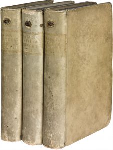 VASARI (Giorgio). Le Vite de' più Eccellenti pittori, scultori et architetti. Bologne, héritiers d'Evangelista Dozza, 1647. 3 volumes in-4, vélin rigide ivoire, dos lisse, petite pièce de cote en tête, tranches bleues (Reliure italienne de...