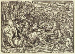 Très rare et belle édition imprimée à Francfort-sur-le-Main par les grands éditeurs Jean et Sigismond Feyerabend. Elle est ornée d’un superbe titre en rouge et noir dans un encadrement ornementé gravé sur bois, et de 101 belles gravures sur bois dans le texte de Jost Amman, qui est, d’après Moreau, l’une des plus belles suites du XVIe siècle. La grande marque typographique de George Corvin figure à la fin du volume. Mouillure en pied et tête, rousseurs uniformes à quelques cahiers. Dos refait, taches à la reliure, doublure et gardes renouvelées.