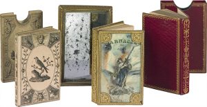 ▪ Les Métamorphoses de l'amour, ou les Plaisirs de chaque mois. Dédié au beau sexe. Paris, Lefuel, [1809]. In-32, bradel cartonnage illustré sur les plats et le dos de dessins gravés, tranches dorées, étui orné de même (Reliure de l'éditeur). Recueil de poésies suivi d'un calendrier pour 1809, orné d'un titre gravé et de 12 figures hors texte d'Amours et de Zodiaques. Exemplaire sur vélin avec les gravures en noir. Étui terni. Grand-Carteret, n°3397. ▪ Almanach de la Cour, de la Ville et des Départements pour l'année 1816. Paris, Janet, [1816]. In-24, bradel cartonnage papier maroquiné rouge, roulette dorée en encadrement, dos lisse orné d'une roulette en long, tranches dorées, étui orné de même (Reliure de l'éditeur). Titre gravé, 4 eaux-fortes hors texte par Janet. Charmant exemplaire, en belle condition malgré de petites piqûres de ver sur un mors. Grand-Carteret, n°1480.