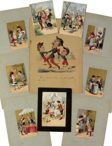▪ 6 gouaches originales vers 1900 (11 x 7 cm), rehaussées d'or, gommées et chacune contrecollée sur papier fort. Les sujets sont ceux d'une série de chromolithograhies publicitaires, intitulés Le pain d'épice ; Les frites ; La galette ; Voilà le plaisir de Mesdames ; Les marrons et Le coco. ▪ 3 gouaches originales vers 1900 (13 x 9 cm), rehaussées d'aquarelle et gommées, probablement d'une série de chromolithographies, représentant des enfants prenant le thé, jouant au badminton et promenant un landau. ▪ 1 aquarelle réhaussée (30 x 21 cm), signée Lavrate (1829-1888), contrecollée, représentant une caricature légendée On a souvent besoin de plus petit que soi.