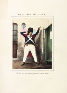 BOUCHOT (Frédéric). Tribulations de la Garde nationale. S.l.n.d. [Paris, Aubert, vers 1840]. Grand in-4, bradel demi-percaline lie-de-vin avec coins, dos lisse, pièce de titre en long (Reliure vers 1900).