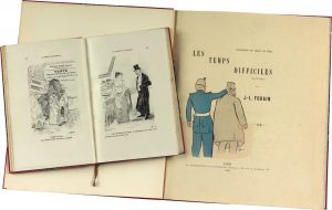 Édition originale, illustrée de 250 dessins de Forain, dont 2 en couleurs sur la couverture, et d'une affiche dépliante en couleurs pour la publication de l'ouvrage. Un des 100 exemplaires réimposés au format in-8 sur chine, seul grand papier. Tavelures, dos passé. Piqûres sur les tranches.