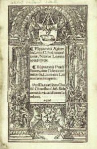 Moreau, III, n°1032. Rare édition des Aphorismes d’Hippocrate avec les com- mentaires de Galien, traduits par le médecin et humaniste vénitien Niccolo Leoniceno (1428-1524) qui enseigna la médecine à Ferrare pendant plus de soixante ans avant de se consacrer à la littérature et à l’étude de l’Antiquité. Les Praedicationes, également commentées par Galien, sont quant à elles présentées dans la version de Lorenzo Lorenzi (1450-v. 1502). Jolie impression en caractères romains, avec lettrines et initiales ornées. Titre dans un cadre architectural gravé sur bois, comprenant la marque de Claude Chevallon. Marque typographique de Chevallon au verso du dernier feuillet. Anciens ex-libris manuscrits, dont celui d’un chirurgien. Tache brune plus ou moins importante touchant l’angle supérieur de plusieurs cahiers, principalement sur la seconde moitié du volume. Reliure restaurée.