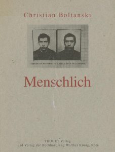 Boltanski, Christian (né en 1944) Menschlich. Thouet Verlag - Verlag Der Buchhandlung Walther König, Köln, 1994. In-8 (26,5 x 21 cm). Édition originale. Couverture souple illustrée (dos légèrement insolé).
